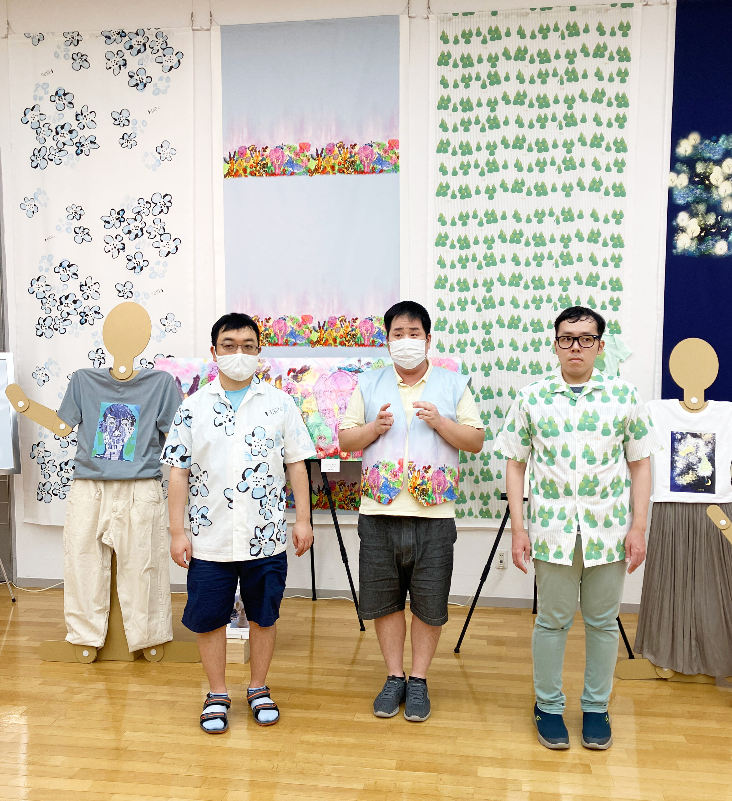 そして皆さんに、本展示会の目玉の布地の前でこちらで試作した服を着ていただきました!