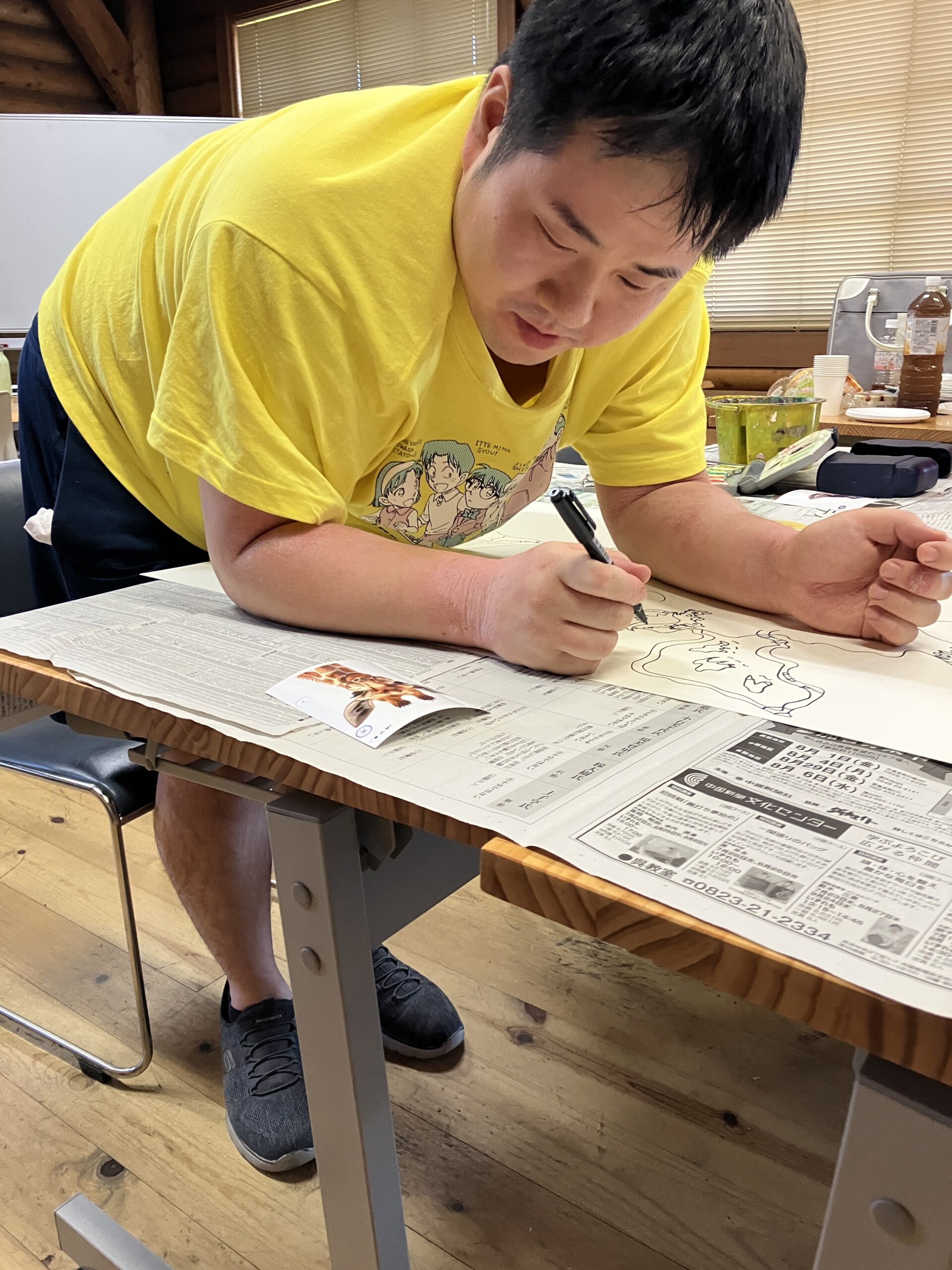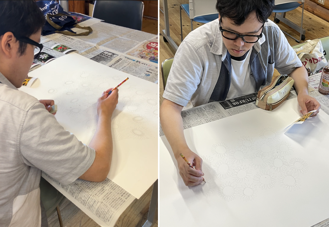 細木さん、大きな紙にひまわりをたくさん描いています!🌻