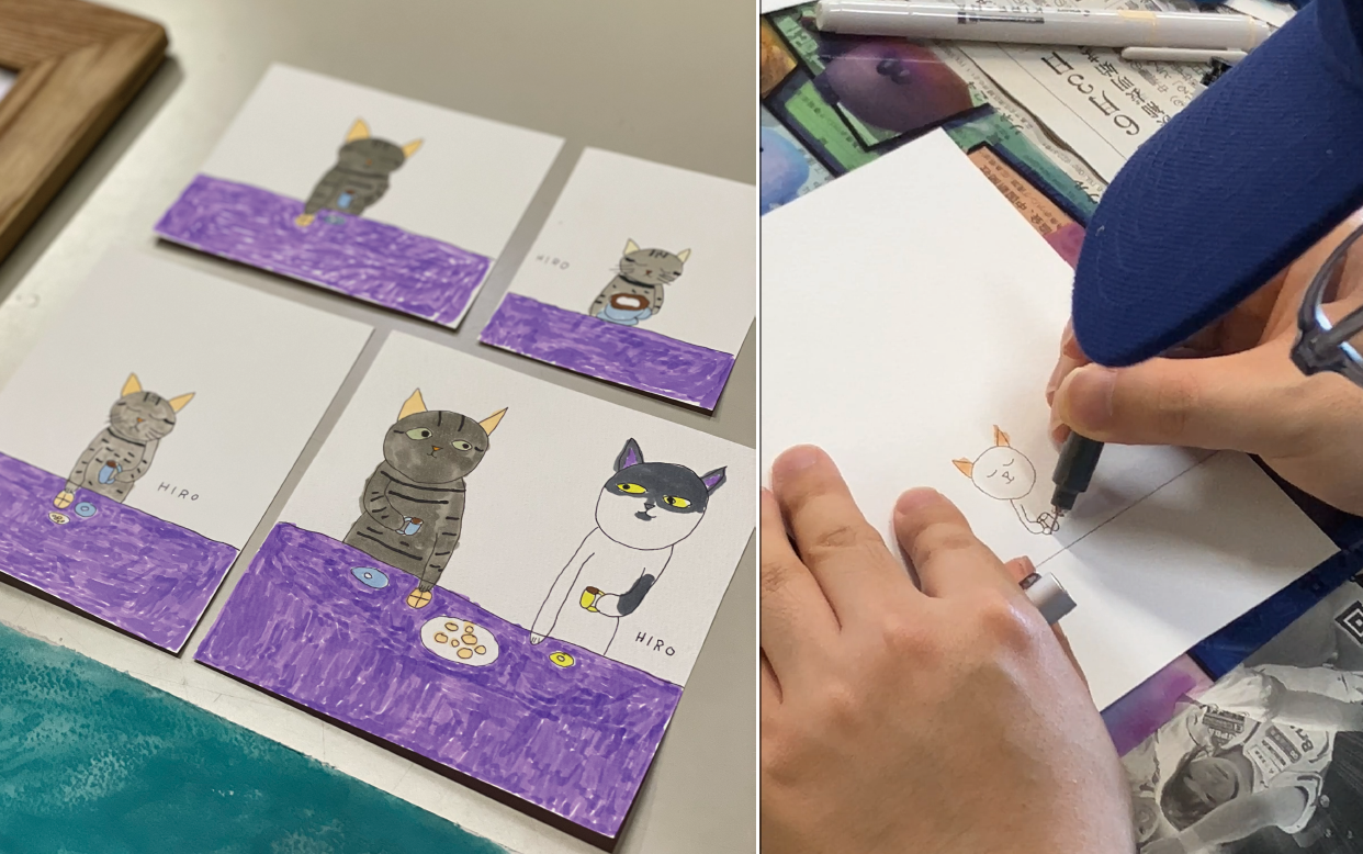 今田さんは、最近お気に入りのカフェにゃんシリーズを黙々と制作中。☕
