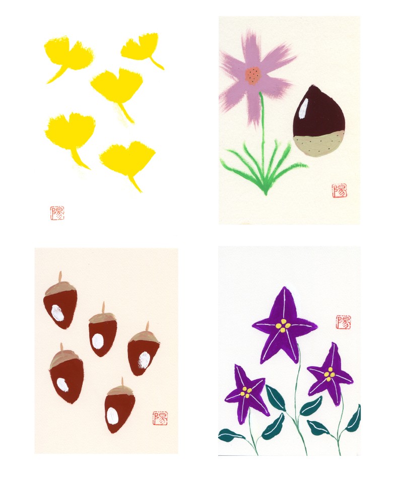 左上から、細木さん作「イチョウ(5枚)」「コスモスと栗」「どんぐり(5個)」「すみれ」です。