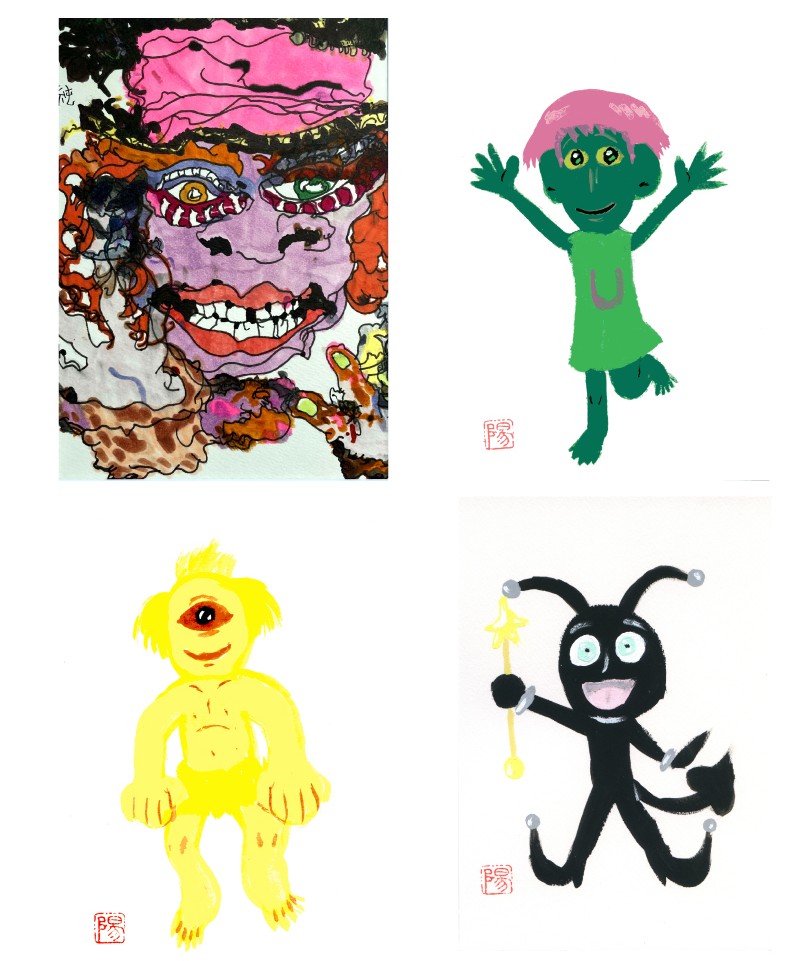 左上から、鬼頭さん作「マッドハッター」、細木さん作「緑の幼女」「一つ目怪物」「やさしい悪魔」です。